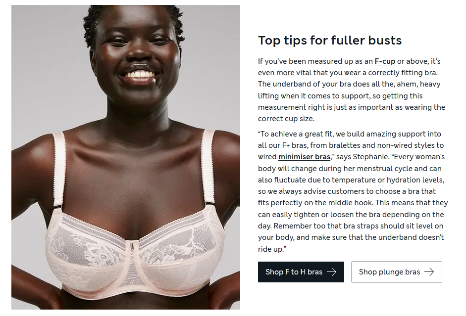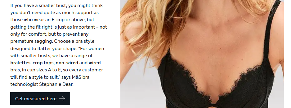 The size dropdown menu still includes sizes A-E, which should be omitted given M&S’ definitions of smaller and fuller busts.
