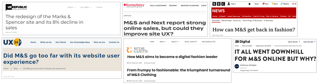 - Articles from eConsultancy and Experience UX, assessing the 2016 site let me compare features against the 2024 live site. It proved invaluable during discovery by demonstrating how M&S had lost critical functionality.