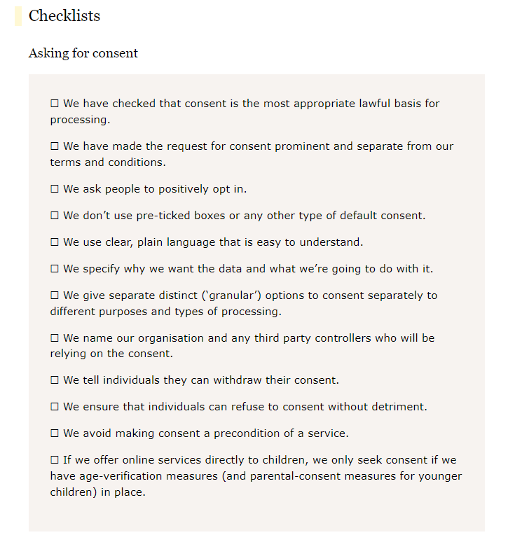 I collected the respective cookie banners and used the checklist from the Information Commissioner’s Office (ICO) to determine what we needed to cover to obtain informed consent.